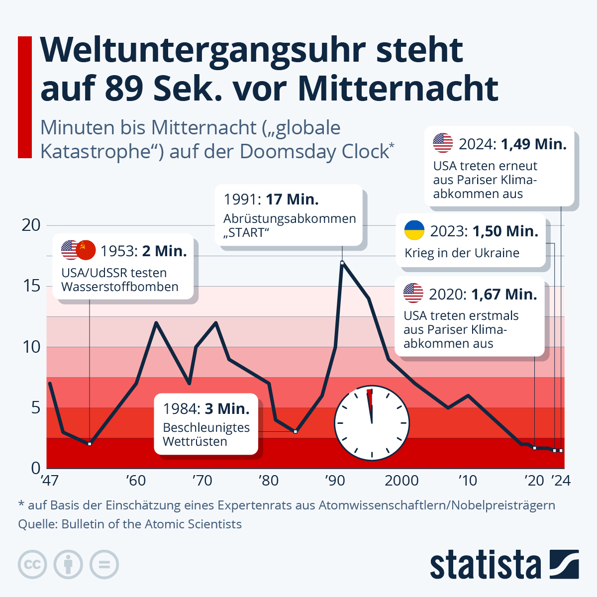 Wie die Statista-Grafik außerdem zeigt, wurde die Weltuntergangsuhr erstmals im Jahr 2020 unter der Grenze von zwei Minuten bis Mitternacht justiert. Die Wissenschaftler des Bulletins gaben die Zeit bis zur ultimativen Katastrophe mit "100 Sekunden" an. Als Gründe hierfür wurden die Corona-Krise, der voranschreitende Klimawandel, die Verbreitung sogenannter Fake News, d.h. falscher und irreführender Informationen, sowie eine zugespitzte weltpolitische Lage genannt. Der russische Angriff auf die Ukraine verschärfte die geopolitische Situation deutlich, was die Forscher Anfang 2023 veranlasste, die Weltuntergangsuhr von 107 auf 90 Sekunden (1,5 Minuten) vor Mitternacht vorzustellen.