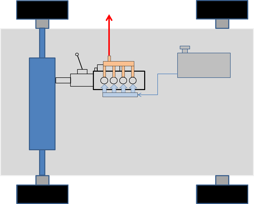 Ein Benzin, Diesel oder Gas-Verbrennungsmotor gibt seine Leistung an die Antriebsachse.