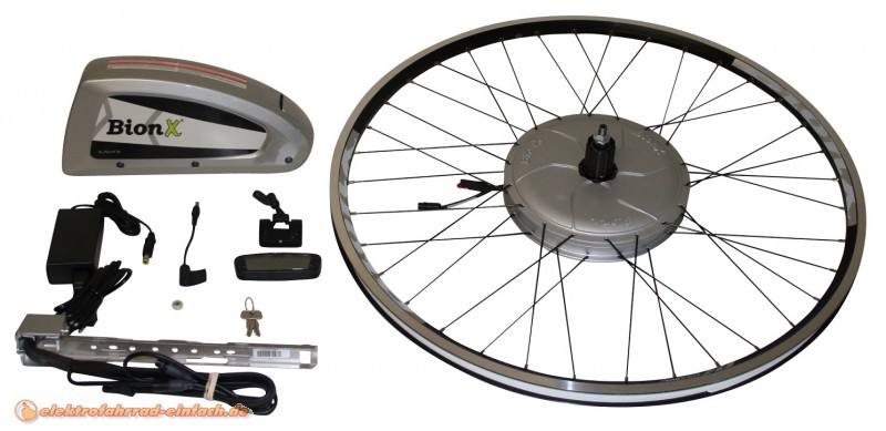 In einem Umbausatz von BionX sind alle notwendigen Bauteile vorhanden inklusive dem fertig eingespeichten Hinterrad mit Zahnradsatz für Kettenschaltung.